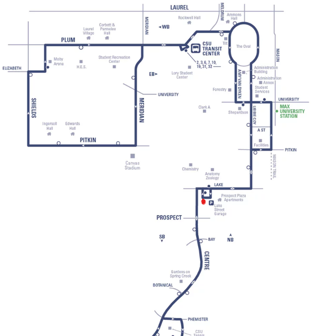 The Lory Student Center (center of campus) and the Department of Forestry are 0.6 miles (14 minutes walking distance) from the hotel. You can also take the campus shuttle ‘Around the Horn’ for free, which provides 10-minute service across campus from 6:54 a.m. to 6:32 p.m. Monday – Friday, with 20-minute service on Saturday. Check out the ‘Around the Horn’ route and schedule here: https://ridetransfort.com/routes/horn/.
